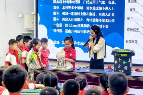 为激发学生科学兴趣,普及气象知识,近日,“追光而行·星耀锦江”科学家(精神)进校园活动走进成都市天涯石小学昭忠祠分校。活动由成都市锦江区教育局、锦江区科学技术协会联合主办,锦江区青少年宫、成都市科学传播学会共同承办,特别邀请成都市温江区气象局科普中心主任李红菲老师,以《气象探秘黑科技》为题,为同学们带来了一场精彩的气象科普盛宴。本次活动创新采用“科普讲座+设备实操+情景模拟”三维模式,将知识讲解与互动体验深度融合,以“可听、可触、可感”的沉浸式体验,为学生架起气象理论与实践探索的桥梁。