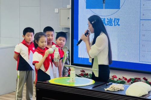 为让抽象的气象知识具象化,李老师携带风向风速仪、翻斗雨量计等专业仪器到场,并设计了“你出题,我挑战”的互动环节。孩子们热情高涨,纷纷提出各种问题,如“测今日风速”“模拟5mm降雨量”等。台上的同学动手操作设备,在趣味挑战中掌握风向判断、风速读取、雨量测量原理。