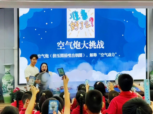 活动高潮环节,“空气炮大挑战”精彩上演。李老师启动特制设备,一个个清晰的烟圈呼啸而出,精准击中同学们手中的气象知识卡片,现场欢呼声不断。实验直观展现空气动力学原理,将同学们对科学的探索热情推向顶峰。
