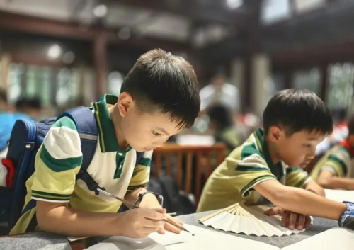 “执笔绘扇面”活动更是将孩子们的创意与才情展现得淋漓尽致。他们充分发挥想象力,在扇面上绘制出心中对古典诗文意境的理解。有的画上苏轼笔下的山水,有的写上东坡居士的名句,每一幅作品都充满了童真与创意。