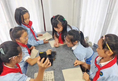 在活字印刷体验环节,孩子们亲手排版、拓印,感受古代印刷术的智慧与魅力。他们小心翼翼地将一个个活字排列整齐,蘸上墨汁,轻轻拓印。当一张张印有苏轼诗词的纸张展现在眼前时,孩子们的脸上露出了自豪的笑容。