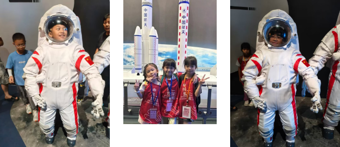 “飞天之梦” 展馆是孩子们最期待的 “宇宙探索站”。分为 “挑战天空”“飞向太空”“星际探秘” 三个区域的展馆,让孩子们一站式解锁 “航空航天” 的奥秘:他们跟着老师学习飞机飞行的基本原理,看着航空飞行器的模型,忍不住伸手触摸;穿上迷你版宇航服拍照时,孩子们挺直腰板,仿佛真的成为了 “探索太空的宇航员”;在模拟飞行体验区,孩子们握着操纵杆,感受 “驾驶飞机” 的乐趣,对 “宇宙” 的向往在心中悄悄萌芽。