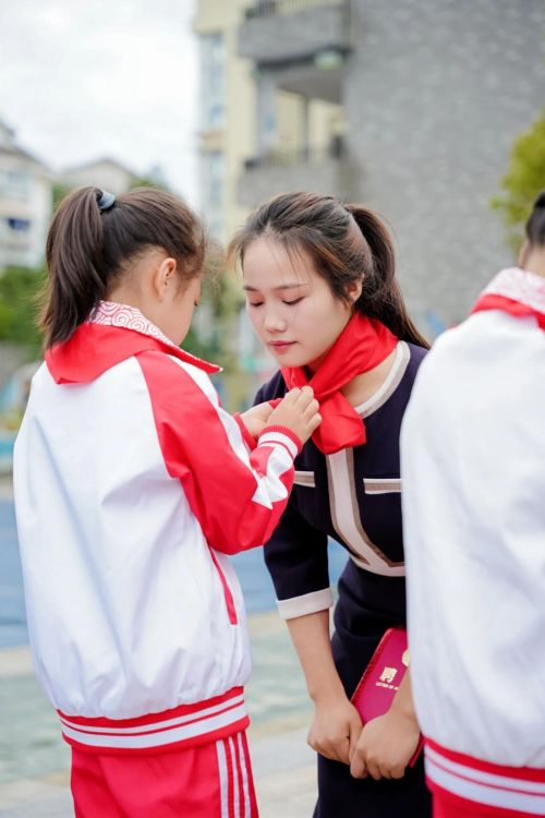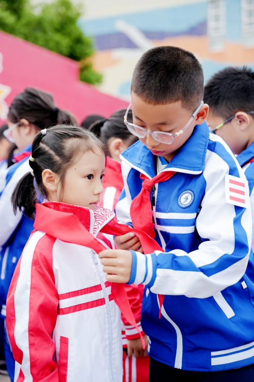 五年级的优秀老队员代表迈着整齐的步伐,为新队员们佩戴上鲜艳的红领巾。这抹革命先烈用鲜血染红的颜色,象征着荣誉,更承载着责任。新老队员互敬队礼,这是荣耀的传递,更是精神的传承。