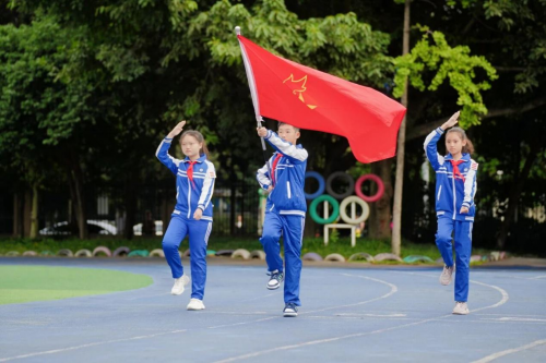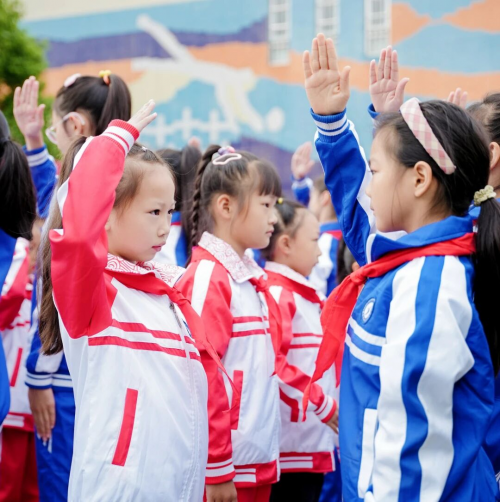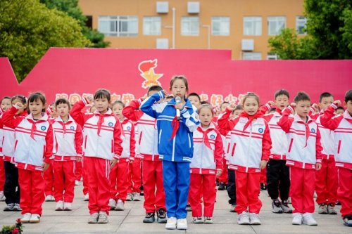 “出旗!奏乐!敬礼!”随着口令的下达,鲜艳的队旗在旗手的护卫下庄严入场。全体队员的目光紧紧跟随着队旗,眼神中满是崇敬与自豪。随后,全场齐声高唱《中国少年先锋队队歌》,嘹亮的歌声响彻校园,唱出了新时代少先队员的蓬勃朝气与坚定信念,仿佛在向世界宣告:新时代的少年,已经准备好肩负起时代的重任。