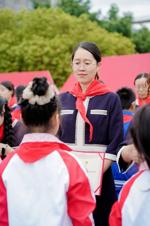 在热烈的掌声中,新一届中队辅导员老师们闪亮登场。少先队员为他们佩戴上鲜艳的红领巾,学校少工委领导为他们颁发聘书。一条红领巾,系满敬意;一份聘书,承载担当。从此刻起,他们正式成为队员们成长路上的亲密伙伴与引路人。
