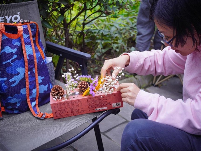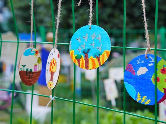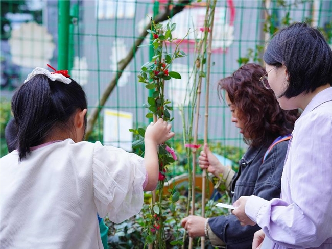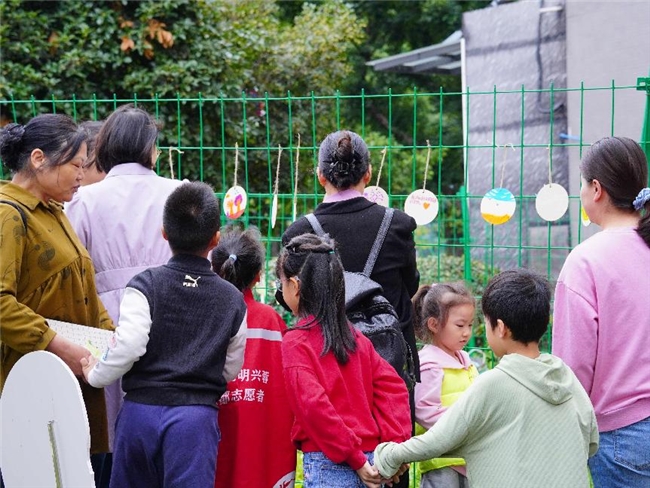 居民们还共同种下月季花苗。虽然尚未盛开,但大家期待两三个月后花开成门的景象——这扇“花门”不仅是一处自然风景,更象征着社区共建共享的成果与希望。活动中,家长与孩子们共同创作“秋意艺术展带”,在木盘上绘制稻穗、飞鸟与果实,用色彩描绘心中的秋天。风吹过时,画盘轻轻摇曳,成为田园里一道流动的风景。