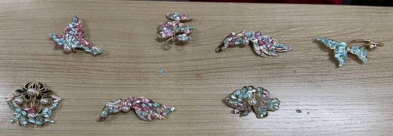 活动中大家积极参与,通过自己的巧妙构思,都做出了自己喜欢的作品,将颜色不一的饰品镶嵌到款式不一的胸针上,既美观、又达到了变废为宝的作用,实现了低碳环保的目标。