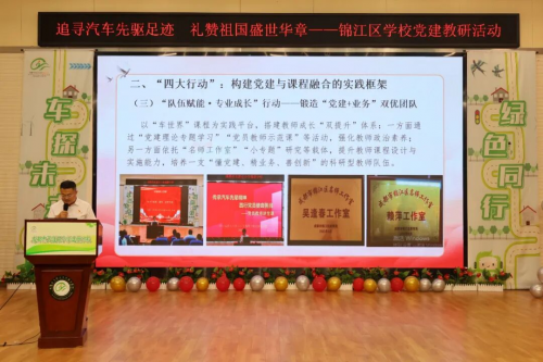 成都市天涯石小学逸景分校专职副书 记董祖斌作了《党建引领聚合力,特色课程育新人》的专题汇报。“学校将党建作为办学治校的‘根’与‘魂’,牢牢把握党对教育工作的全面领导,实现从‘基础探索’到‘特色融合’的跨越式提升。”他表示,学校以“车世界”为载体,构建“党建 + 课程”融合框架,因地制宜走党建融合发展的路径,推动五育融合,为培养时代新人注入强劲动力。