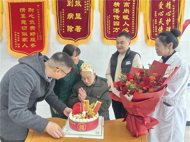 老干部服务中心领导为陈爷爷送上精心准备的生日蛋糕与鲜花,共唱生日歌,向陈爷爷致以诚挚的生日祝福,并与老人亲切交谈,关切询问他的身体状况和在院生活情况,叮嘱他保重身体、乐享晚年,现场气氛融洽,欢声笑语不断。陈爷爷对老干部服务中心及江油市铁路医院工作人员的关怀表达了由衷感谢。