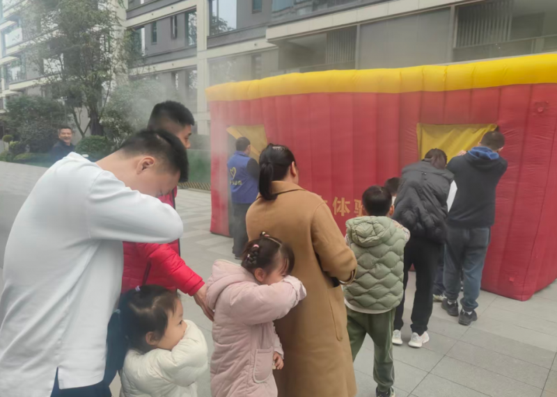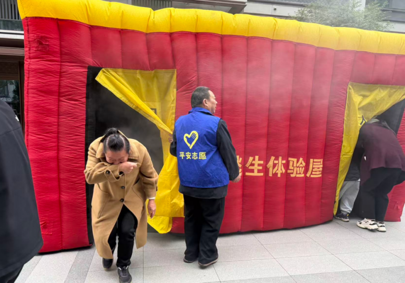 火灾逃生体验屋前,参与者有序排队。屋内模拟的浓烟环境让体验者真切感受视线受阻的困境,“弯腰、捂口鼻、沿墙走”,在消防员引导下,大家顺利撤离至安全区。“以前总觉得火灾离得远,这体验让我知道规范逃生多重要”,居民王女士深有感触的说。