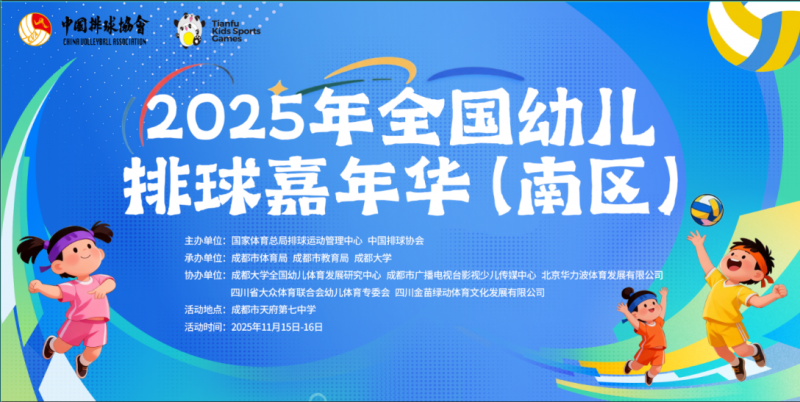 为落实《“健康中国2030”规划纲要》精神,深化体教融合,促进幼儿排球运动普及与发展,由国家体育总局排球运动管理中心、中国排球协会共同主办,成都市体育局、成都市教育局、成都大学联合承办的2025年全国幼儿排球嘉年华(南区)活动,于2025年11月15日至16日在天府第七中学体育馆成功举行。作为一项国家级幼儿体育盛会,本次活动致力于为全国幼儿打造一场融合趣味、竞技与交流的排球运动嘉年华。