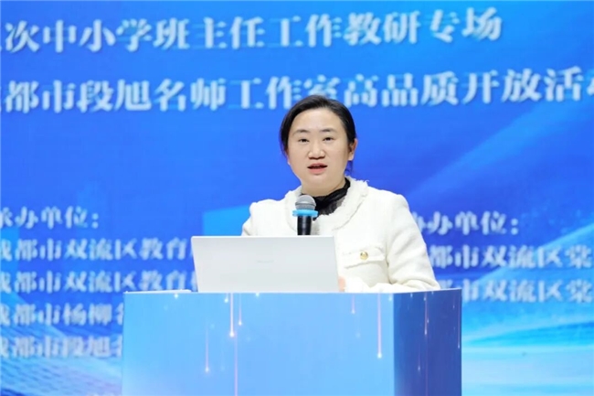 成都市段旭名师工作室成员姜蔚老师结合学校校本研修实践案例,以《研修三步走:小学主题微班课的校本化实施路径》为题做专题讲座。姜老师聚焦 “授之以渔” 三步走策略,先点出班主任微班课“认知、工具、机制”断层问题,再详解“照着上、学着改、试着创”步骤,通过年级组、新教师、大团队三级共创模式激发自主研发活力,分享教师成长、学生变化、区域共享成果,为提升教师班会课能力提供方案。