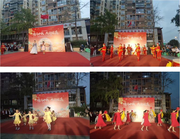 9月27日晚上7:00,文艺演出活动在龙安社区文化广场上正式开始,演出的节目全是由社区居民们自编、自导、自演,腰鼓舞《欢乐江西腰鼓》用响亮的鼓点正式为演出拉开帷幕,拉丁舞《芭比公主》、舞蹈《套马杆》、空竹表演《龙在飞凤在舞》、合唱《最美的歌儿唱给妈妈》、《防诈骗宣传小品》、舞蹈《我的中国心》、《太极功夫扇》、舞蹈《花好月圆》、舞蹈《不忘初心》在社区居民的演绎下,引得现场观众掌声连连;特别是情景舞《携手前进,温暖同行》,讲述了龙安社区帮帮团的成员们在平时工作中的点点滴滴,通过自身努力,共同建设美好龙安的故事。
