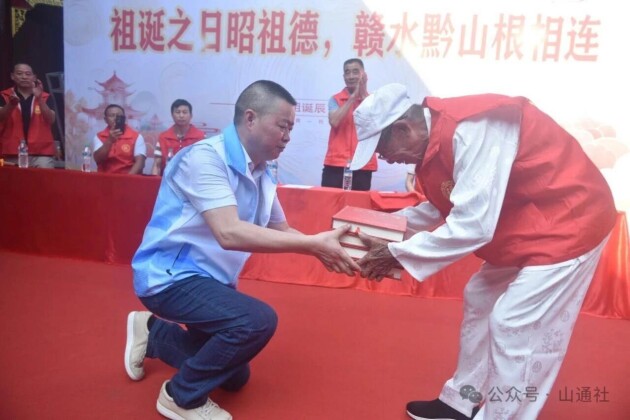 最激动人心的时刻到来:族谱交接仪式。张永勇代表贵州支系,双手捧着泛黄的家谱缓步走上主台;老族长张开均宗长上前郑重接过。两位宗亲的手紧紧相握,象征着断裂数百年的血脉在此刻重新连接。摄影师定格下这一历史性瞬间:一本旧谱与一本新修总谱并列摆放,封面赫然写着“仕魁公派下堂公房世系”。