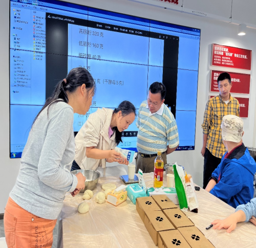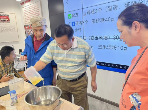 街道以“实用适配、学用结合”为原则,前期通过调研,精准对接残疾人技能需求与小吃甜品市场趋势,定制专属培训方案。特邀拥有多年教学经验的老师专业授课,采用“理论精讲+实操演练+精准辅导”的立体教学模式。理论课堂上,系统讲解食材特性、配比换算、食品安全规范及成本核算等基础知识点,筑牢技能根基;实操环节中,讲师针对不同残疾类型学员的学习特点,将复杂工序拆解为易懂步骤,从中式糖水的食材熬煮火候、雪花酥的原料混合技巧,到水果蛋糕的抹面塑形、披萨的面团发酵与芝士铺撒,再到毛巾卷的薄皮煎制与奶油调配,均进行手把手示范。对于沟通有障碍的学员,辅以文字提示与动作演示,确保每位学员都能跟上节奏、学会技能。