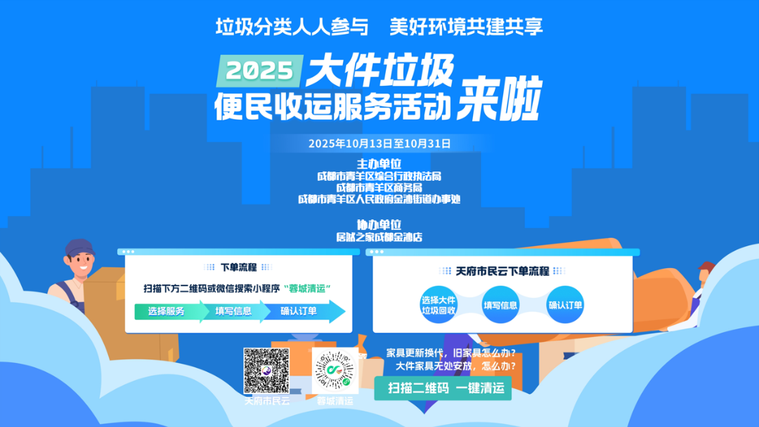 居民可以通过 “天府市民云” 、“蓉城清运”微信小程序在线预约,专业团队上门收运。处理旧物,还有额外福利。