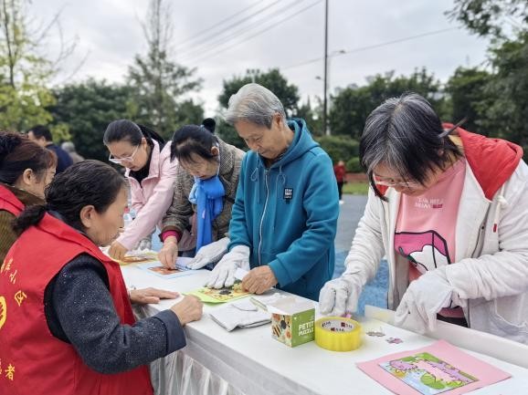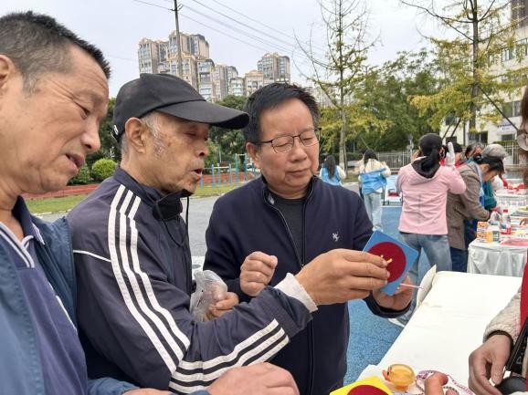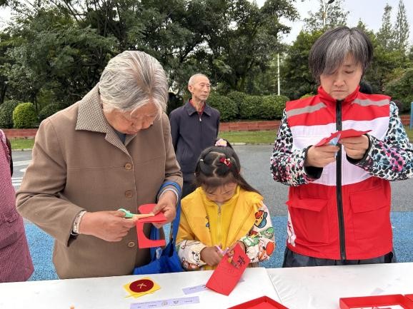 互动体验区以剪纸传统艺术为纽带,在社团的通力协作下,代际小组开展创作体验活动。孩子们和长者围坐在一起,小手在大手的引导下,小心翼翼地转动红纸、操持剪刀。不一会儿,寓意吉祥的窗花、栩栩如生的动物便在一双双巧手下诞生。现场欢声笑语不断,这不仅是传统技艺的传承,更是情感的温暖传递,一张张剪纸成为了连接代际的美丽纽带。