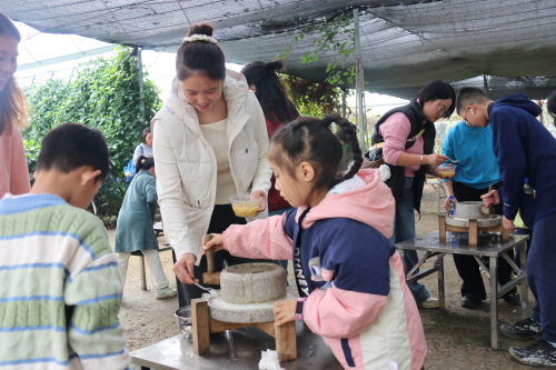 孩子们在农耕文化的熏陶下孩子们走进果林,开启探秘之旅,亲手捡鸡蛋,感受大自然的魅力与生命的奇妙。参观天府农耕文化博物馆时,孩子们认真聆听讲解,深入了解天府地区悠久的农耕历史和丰富的文化内涵。此外,非遗石磨豆浆的体验活动也让孩子们大开眼界,他们亲手操作石磨,品尝自己制作的豆浆,体会传统技艺的独特魅力。