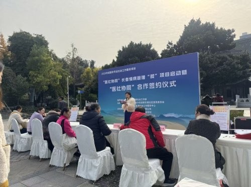 近日,成都市双流区东升街道紫东阁社区广场暖意融融,“医社协同”长者慢病管理“微”项目合作签约仪式顺利举行。本次活动由双流区委社会工作部指导,棠湖社会工作服务中心与紫东阁社区居民委员会联合主办,成都好了么医生集团、棠湖职业培训学校、成都精典口腔、惠耳听力等单位共同支持,近30名慢病长者代表、医护人员、志愿者及社区居民参与其中,标志着社区慢病管理迈入“专业医疗+社工服务+志愿支持”的联动新阶段。