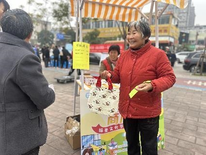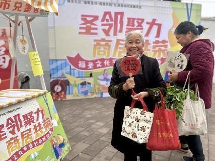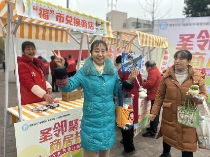活动现场热闹非凡,“互动任务卡”成为居民参与活动的核心凭证。居民签到领取卡片后,即可参与邻里互动任务区的各类趣味活动,完成每项任务可兑换相应数量的“福”币,累计后可前往商户展示兑换区换取体验项目或特色商品,让“集福”“换享”的核心逻辑贯穿全程,充分调动了居民参与热情。