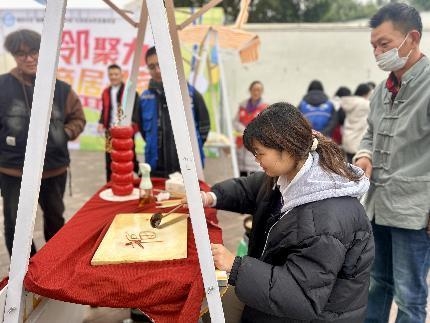 商户展示兑换区同样人气爆棚,辖区内多家商户积极参与,带来了丰富多样的兑换项目与特色服务,实现了商业价值与社区服务的有机融合。社区书店推出图书漂流兑换活动,居民凭“福”币即可兑换闲置图书,同时开展特价商品展售,标注“福币抵扣价”,支持“福”币+现金组合支付,兼顾公益属性与商业互动;辖区商超带来特色商品兑换与低价特卖活动,不同商品设定清晰的福币兑换规则,灵活的支付方式让居民享受实实在在的优惠;烘焙店的糖画体验教学备受欢迎,工作人员现场演示糖画制作流程,居民凭“福”币兑换体验资格,在工作人员指导下完成简易糖画作品;艺术培训机构则推出书法体验教学与文创小礼物赠送活动,专业老师指导居民书写“福”字,完成的作品可自行带走,体验结束后每位参与者还能免费领取定制书签、福字文创等礼品,现场推出的专属报名优惠也吸引了不少家长关注。