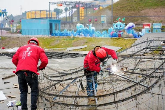行走在园区内不难发现,已有不少灯组开始进场布置,巨型灯组的骨架已初具雏形。“截至29日,已有17家灯企入场,25个点位开展作业,造型工、电工、焊工等近一千人在园区内施工。”华荟文化公司工程负责人张华告诉记者,“项目按天推进打卡,目前已完成约总进度的63%。”