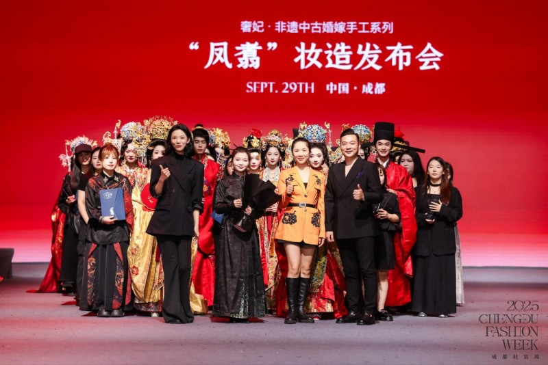 29日闭幕式下午,2025成都时装周迎来了最具文化厚重感与视觉震撼力的一幕。美丽的天府之国,一场名为“凤翥”的妆造发布会,“奢妃”品牌重磅推出的“非遗中古婚嫁手工系列”,为所有来宾铺开了一幅流动的、承载着千年东方美学的奢华画卷。这不仅是一场时装秀,更是一次对中华传统婚嫁文化与精湛手工技艺的深情致敬与当代焕新。