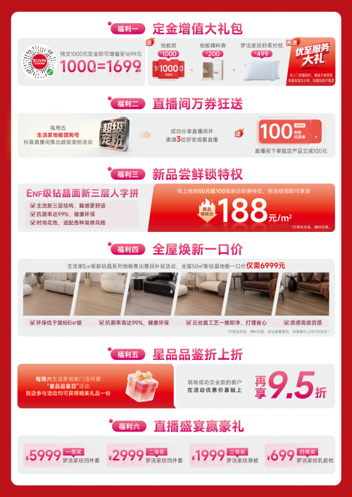 生活家地板的普惠理念,不止体现在核心产品的价格上,更渗透在整个消费流程的细节中。为了让消费者获得 “超出预期” 的购物体验,此次超级星品日打造了一套全链路福利组合拳:线上推出定金增值活动,提前锁定优惠更划算;定时开启秒杀福利,热门产品以惊喜价限时抢购;直播间内专属让利,主播实时解答疑问,直观展示产品细节;线下到店更有专属惊喜,让消费者亲身感受地板质感的同时,享受一对一的专业服务。