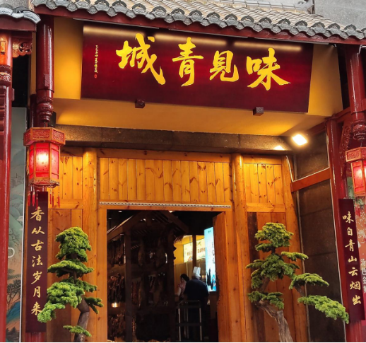 午后的阳光正好,我沿着青城山路慢慢走着,忽然一缕熟悉的烟火香气飘过来——那是柏树枝混着肉脂香的味道,让我驻步在这家“味见青城”的门店前。