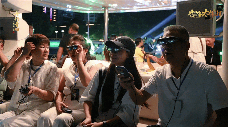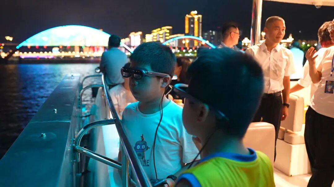 在青田瓯江之上,游客登船后戴上 AR 眼镜,就能看到中西结合的华侨文化“舞台演绎”。随着船只行进,虚拟演绎会在不同景点依次出现,与实景交织成一幅独特的夜游画卷。