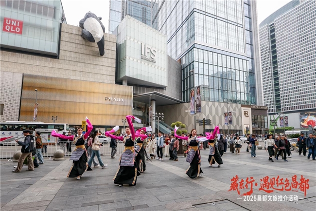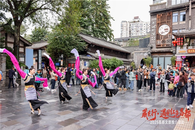 在成都三大城市地标——春熙路、宽窄巷子与东郊记忆,昌都文旅快闪活动以极具视觉冲击力的民族服饰与原生态舞蹈表演惊艳亮相。演员们身着工艺精湛的民族传统盛装,以刚健有力的舞步、富有叙事感的肢体语言,生动演绎藏东地区的文化底蕴。在春熙路的现代繁华与宽窄巷子的市井烟火之间,舞者以极具张力的表演构建起一道流动的文化风景线,吸引众多市民驻足欣赏、主动参与互动,有效提升了“藏东明珠”在西南地区的品牌感染力。